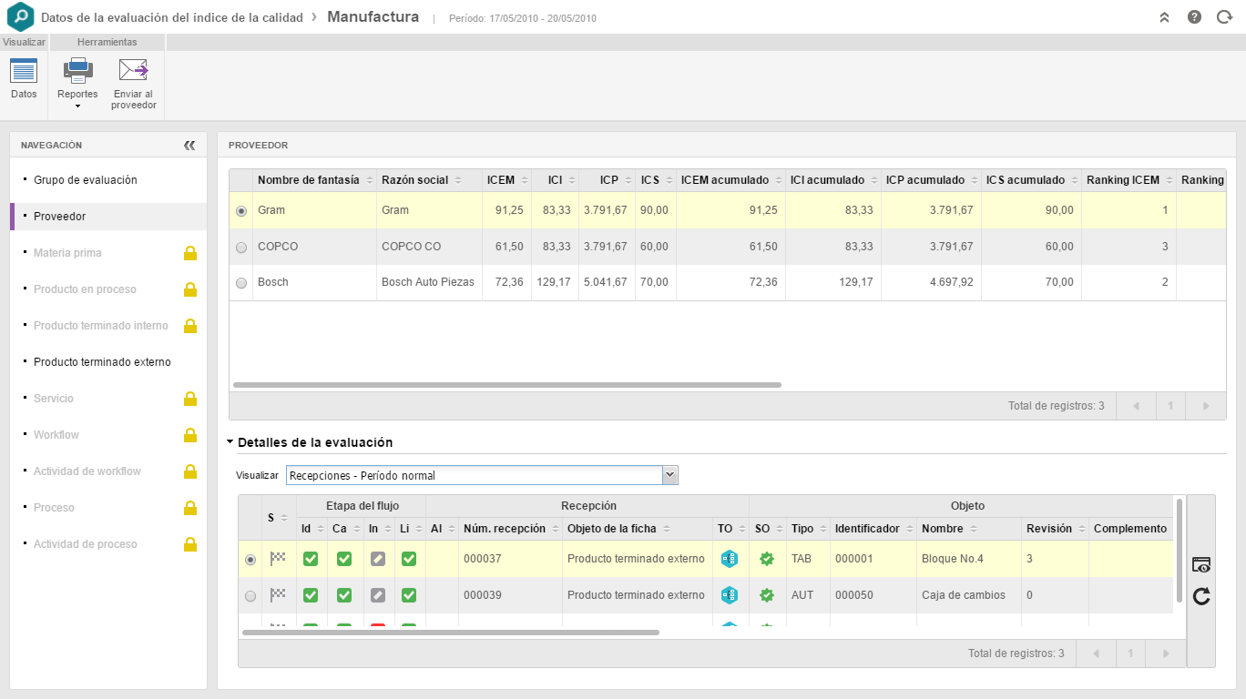 - Actualiza automáticamente los indicadores críticos de los proveedores, incluyendo partes por millón (PPM), entregas en el plazo y cantidades aprobadas.